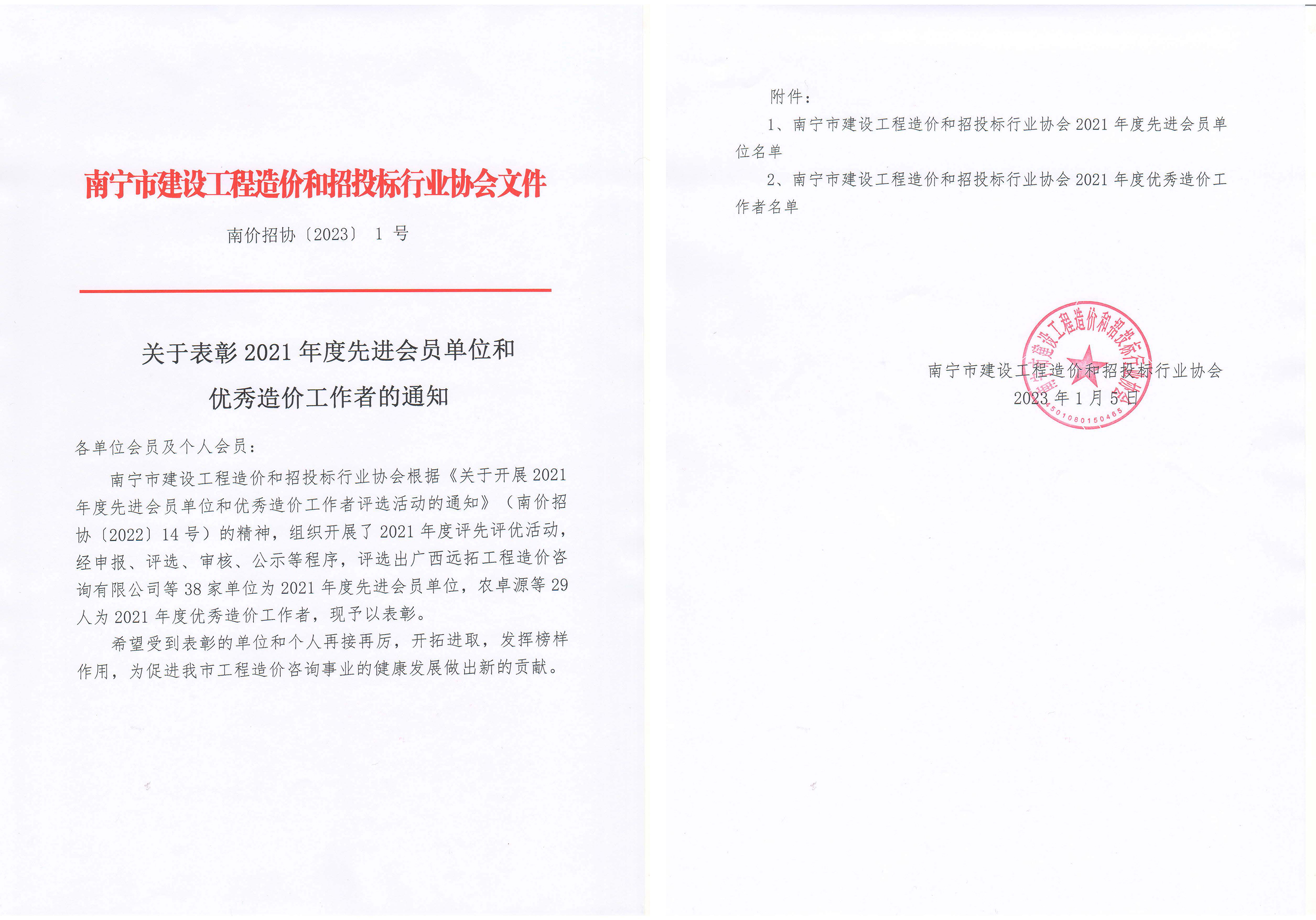 2023年1月5日,南寧市建設(shè)工程造價(jià)和招投標(biāo)行業(yè)協(xié)會(huì)公布了2021年度先進(jìn)會(huì)員單位和優(yōu)秀造價(jià)工作者名單,廣西恒基建設(shè)工程咨詢有限公司憑借在造價(jià)咨詢領(lǐng)域較高的綜合實(shí)力,榮獲“2021年度先進(jìn)會(huì)員單位”榮譽(yù)稱號,公司方興、潘美珍兩位同志獲評協(xié)會(huì)“2021年度優(yōu)秀造價(jià)工作者”。