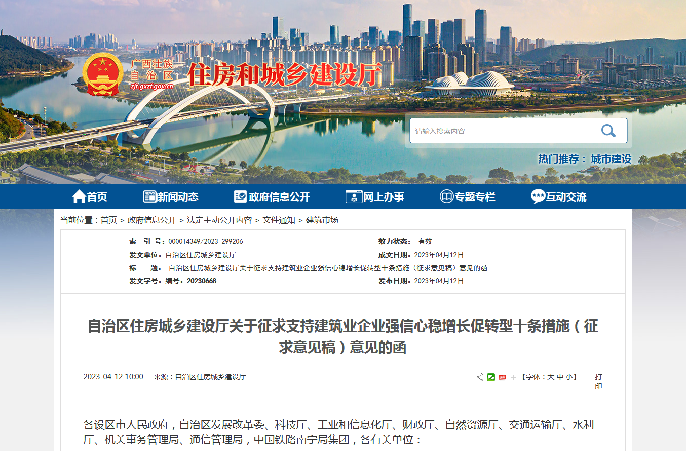為全面貫徹黨的二十大精神,深入落實中央、全區(qū)經(jīng)濟工作會議部署要求,推進政策加力助力全區(qū)經(jīng)濟整體好轉(zhuǎn),積極幫助我區(qū)建筑業(yè)企業(yè)增強發(fā)展信心,持續(xù)推動全區(qū)建筑業(yè)高質(zhì)量發(fā)展,我廳起草了《關(guān)于支持建筑業(yè)企業(yè)強信心穩(wěn)增長促轉(zhuǎn)型十條措施》(征求意見稿),現(xiàn)印發(fā)給你們征求意見。請各單位認(rèn)真研究,于2023年4月27日前將修改意見和建議(含電子文檔)反饋我廳,逾期未反饋意見視為無意見。