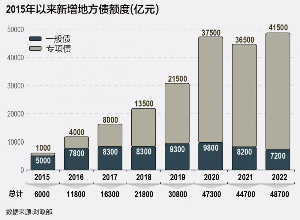 從2014年-2022年歷經(jīng)三任財(cái)長(zhǎng),地方債的顯性化取得長(zhǎng)足進(jìn)展:一方面通過(guò)發(fā)行置換債券將非地方政府債券形式的債務(wù)進(jìn)行置換,另一方面通過(guò)發(fā)行新增債券尤其是新增專項(xiàng)債滿足地方政府的建設(shè)資金需求。