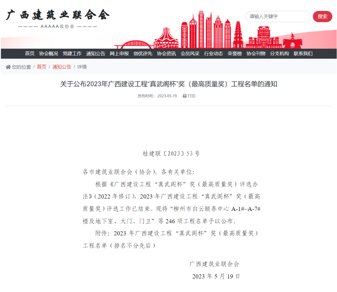 “真武閣杯”獎是廣西建設(shè)行業(yè)工程質(zhì)量的最高榮譽獎項,該獎項的評選工作是在廣西住房和城鄉(xiāng)建設(shè)廳指導(dǎo)下由廣西建筑業(yè)聯(lián)合會組織實施,旨在營造推崇工匠精神的良好社會氛圍,推動廣西建設(shè)工程質(zhì)量水平的提高。根據(jù)評選章程,在獲得廣西建設(shè)工程“真武閣杯”獎(最高質(zhì)量獎)項目后,廣西建筑業(yè)聯(lián)合會將擇優(yōu)推薦作為國家優(yōu)質(zhì)工程獎、中國建設(shè)工程魯班獎等獎項的候選工程項目。