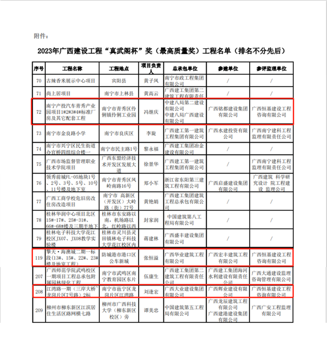近日,廣西建筑業(yè)聯(lián)合會公布了2023年廣西建設(shè)工程“真武閣杯”獎(最高質(zhì)量獎)工程評選結(jié)果。廣西恒基建設(shè)工程咨詢有限公司負(fù)責(zé)監(jiān)理的南寧市江灣路一期(三岸大橋~龍崗片區(qū)7號路)2標(biāo)工程項目、南寧產(chǎn)投汽車青秀產(chǎn)業(yè)園項目1#2#3#4#標(biāo)準(zhǔn)廠房及其它配套工程項目、防城港市擎天·海澳城二期一標(biāo)工程項目榮獲此獎。