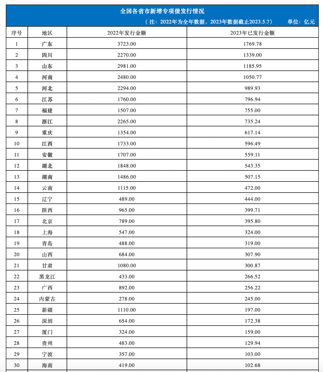 在疫情拖累消費和經(jīng)濟(jì)的背景下,新增債券成為各地穩(wěn)投資的重要工具。整體來看,2022年及2023年新增專項債券的分配,均符合“資金跟著項目走”、向經(jīng)濟(jì)大省傾斜等特點。