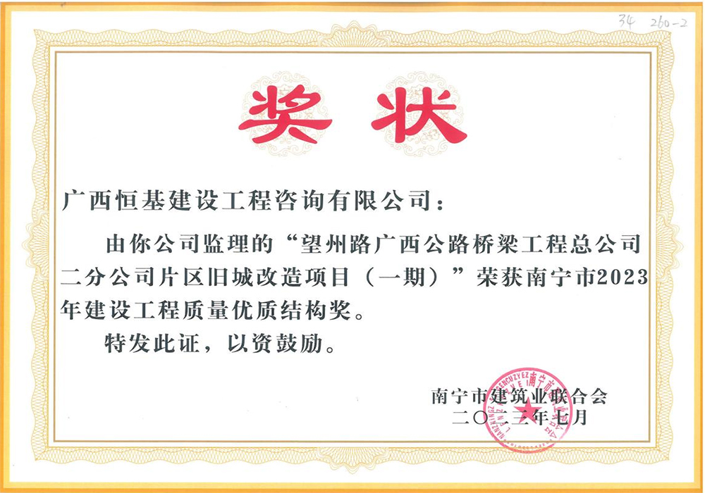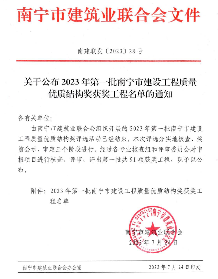 近日,南寧市建筑業(yè)聯(lián)合會公布2023年第一批南寧市建設(shè)工程質(zhì)量優(yōu)質(zhì)結(jié)構(gòu)獎獲獎工程名單,我司望州路廣西公路橋梁工程總公司二分公司片區(qū)舊城改造項目(一期)項目獲獎。