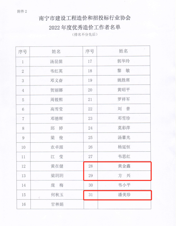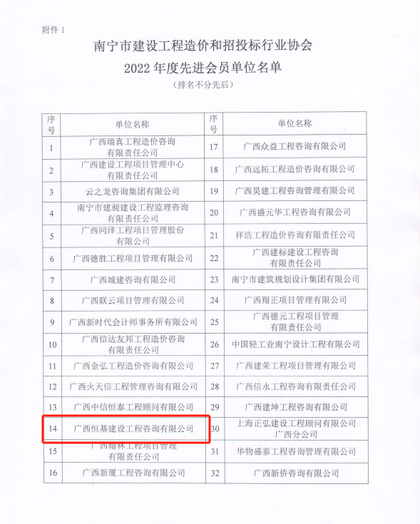 近日,南寧市建設(shè)工程造價和招投標(biāo)行業(yè)協(xié)會公布2022年度先進(jìn)會員單位和優(yōu)秀造價工作者名單,廣西恒基建設(shè)工程咨詢有限公司成功獲評協(xié)會“2022年度先進(jìn)會員單位”,公司黃金鑫、方興、潘美珍3人獲評協(xié)會“2022年度優(yōu)秀造價工作者”。