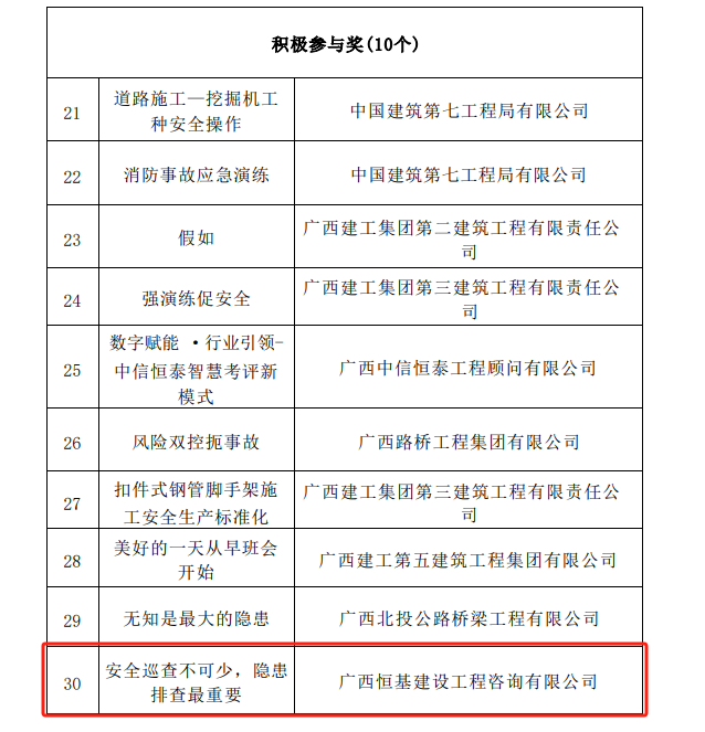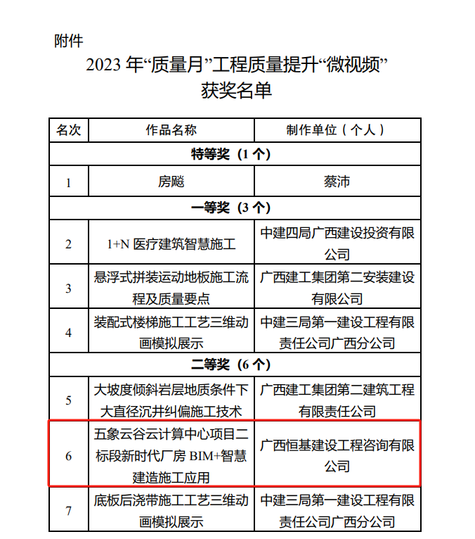 近日,廣西建設(shè)工程質(zhì)量安全管理站公布2023年“質(zhì)量月”工程質(zhì)量提升“微視頻” 獲獎(jiǎng)名單,恒基咨詢選送作品《五象云谷云計(jì)算中心項(xiàng)目二標(biāo)段新時(shí)代廠房BIM+智慧建造施工應(yīng)用》榮獲二等獎(jiǎng)。2023年“安全生產(chǎn)月”安全管理提升“微視頻”征集活動(dòng)選送作品《安全巡查不可少,隱患排查最重要》獲積極參與獎(jiǎng)。