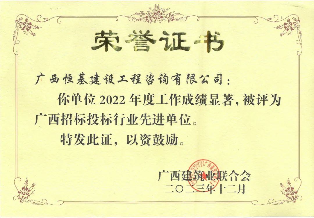 12月25日,廣西建筑業(yè)聯(lián)合會招標(biāo)投標(biāo)分會召開第二屆第五次會員代表大會,會上表彰了2022年度廣西招標(biāo)投標(biāo)行業(yè)先進(jìn)單位和先進(jìn)個人。恒基咨詢榮獲“2022年度廣西招標(biāo)投標(biāo)行業(yè)先進(jìn)單位”稱號,公司8人獲評“2022年度廣西招標(biāo)投標(biāo)行業(yè)先進(jìn)個人”。