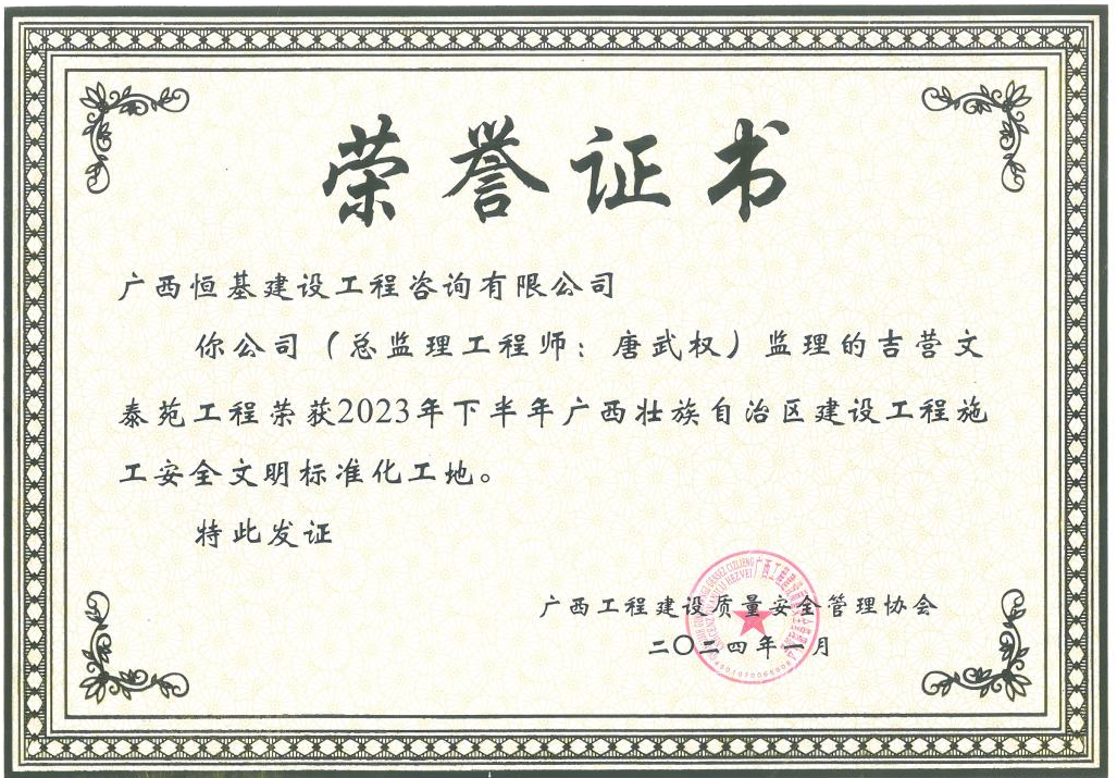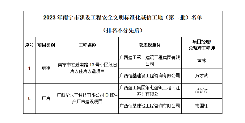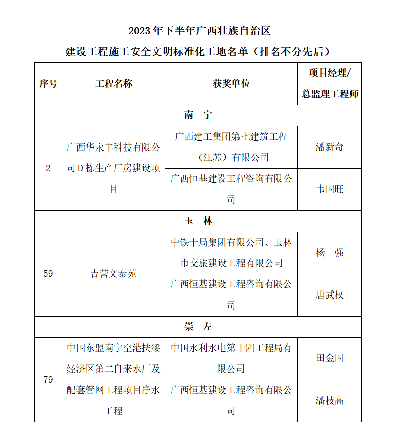 近日,廣西工程建設(shè)質(zhì)量安全管理協(xié)會(huì)、南寧市建設(shè)工程質(zhì)量安全協(xié)會(huì)分別公布了2023年下半年廣西壯族自治區(qū)建設(shè)工程施工安全文明標(biāo)準(zhǔn)化工地名單、2023年南寧市建設(shè)工程安全文明標(biāo)準(zhǔn)化誠(chéng)信工地(第二批)名單。恒基咨詢3個(gè)項(xiàng)目榮獲2023年下半年廣西壯族自治區(qū)建設(shè)工程施工安全文明標(biāo)準(zhǔn)化工地,2個(gè)項(xiàng)目榮獲2023年南寧市建設(shè)工程安全文明標(biāo)準(zhǔn)化誠(chéng)信工地。