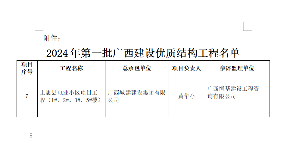 近日,廣西建筑業(yè)聯(lián)合會公布了2024年第一批廣西建設(shè)優(yōu)質(zhì)結(jié)構(gòu)工程名單。恒基咨詢監(jiān)理的上思縣電業(yè)小區(qū)項目工程(1#、2#、3#、5#樓)榮獲該獎項。