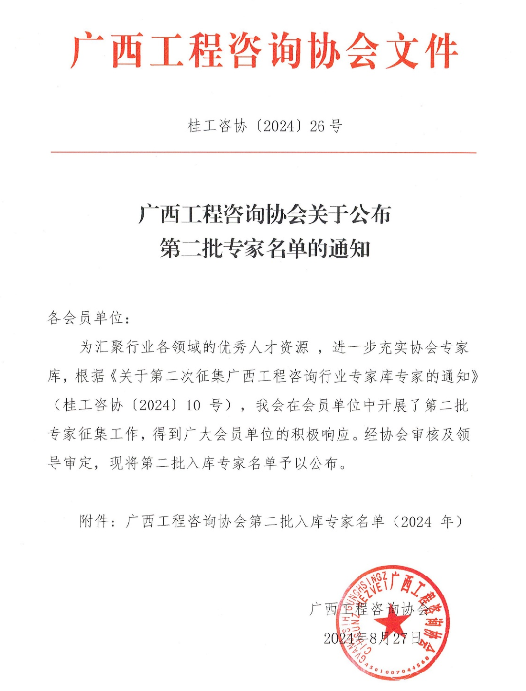 2024年8月27日,廣西工程咨詢協(xié)會公布了第二批入庫專家名單,廣西恒基建設(shè)工程咨詢有限公司周赤衛(wèi)、任坤2位專家順利入庫。